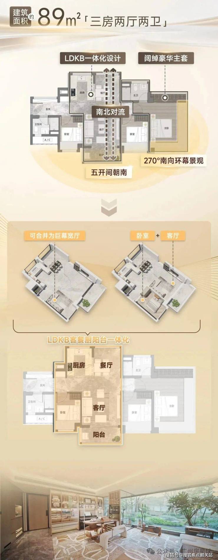 以全新升级的建面约76㎡三房户型为例,这款户型经过了数次优化升级,在空间设计上充分考虑了广州购房者的居住习惯,实现了空间利用率的最大化。户型采用了LDKB一体化的宽厅设计,将客厅、餐厅、厨房、阳台打通,形成了一个开阔的家庭共享复合空间,既可以满足日常的起居、用餐、烹饪需求,也可以根据家庭需求打造亲子互动、休闲娱乐等多元场景,让家庭公共空间的使用更加灵活。