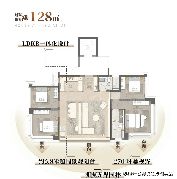 项目推出建面约128-219㎡的大宅,使用率高达约102%,部分户型主卧北向望江,西面有阳光补充,空间舒展度极高。特别值得一提的是,建面约219㎡户型拥有约16米L型阳台,前排约300米无遮挡,可将灵山岛尖的开阔江景、城市图景尽收眼底。