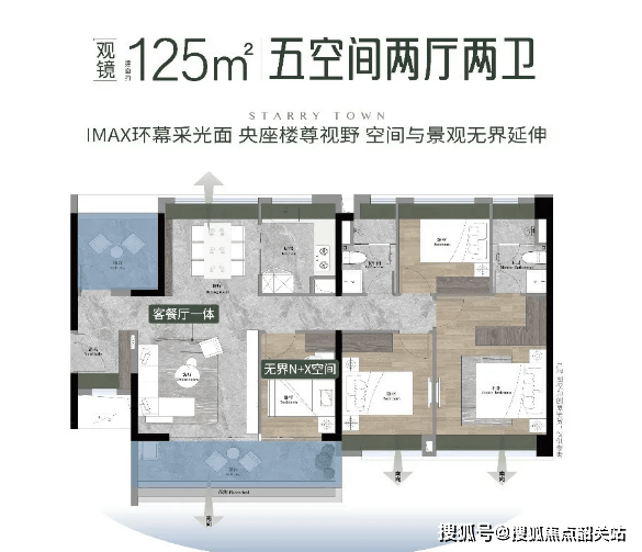 最后给大家介绍的是 125㎡的 5 空间 2 厅 2 卫户型,这个户型是我们的大户型改善产品,适合人口比较多的家庭,这个户型做到了 4.5 开间朝南,客餐厅实现了南北对流,通风采光的效果非常优异,整个房子的通透感非常强,不管是客厅还是卧室,都非常明亮。