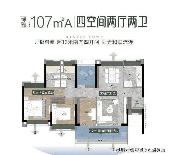 接下来是 107㎡A 的 4 空间 2 厅 2 卫户型,这个户型是我们的改善型横厅户型,非常受年轻改善客户的喜欢,这个户型配备了南向的观景玄关,入户就有满满的仪式感,不会一开门就把家里的情况全部暴露出来,保障了家庭的私密性。