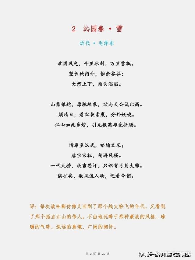 《沁园春·雪》是毛主席创作的一首词。该词上片描写北国壮丽的雪景,纵横千万里,展示了大气磅礴、旷达豪迈的意境,抒发了词人对祖国壮丽河山的热爱。下片议论抒情,重点评论历史人物,歌颂当代英雄,抒发无产阶级要做世界的真正主人的豪情壮志。全词熔写景、议论和抒情于一炉,意境壮美,气势阪宏,感情奔放,胸襟豪迈,颇能代表毛主席诗词的豪放风格。