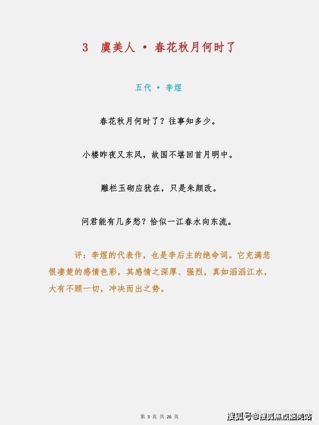 《虞美人·春花秋月何时了》是五代十国时期南唐后主李煜的词作。这是一曲生命的哀歌,作者通过对自然永恒与人生无常的尖锐矛盾的对比,抒发了亡国后顿感生命落空的悲哀。全词语言明净、凝练、优美、清新,以问起,以答结,由问天、问人而到自问,通过凄楚中不无激越的音调和曲折回旋、流走自如的艺术结构,使作者沛然莫御的愁思贯穿始终,形成沁人心脾的美感效应。