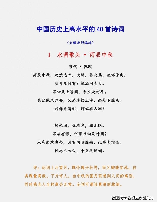 《水调歌头·丙辰中秋》是宋代大文学家苏轼公元1076年(宋神宗熙宁九年)中秋在密州时所作。这首词以月起兴,与其弟苏辙七年未见之情为基础,围绕中秋明月展开想象和思考,把人世间的悲欢离合之情纳入对宇宙人生的哲理性追寻之中,反映了作者复杂而又矛盾的思想感情,又表现出作者热爱生活与积极向上的乐观精神。词作上片问天反映执著人生,下片问月表现善处人生。落笔潇洒,舒卷自如,情与景融,境与思偕,思想深刻而境界高逸,充满哲理,是苏轼词的典范之作。