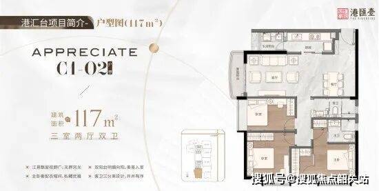 约117㎡三房:双阳台向阳设计,主卧奢配衣帽间,诠释优雅生活美学