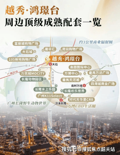 全维度覆盖教育、商业、医疗、生态四大核心配套,采用实景化、场景化描述,拒绝笼统表述。教育配套罗列周边全龄段优质学校、学区划分、师资力量与就学便利度;商业配套介绍周边大型商超、综合体、商业街、生鲜市场,满足日常购物、餐饮、休闲需求;医疗配套标注周边三甲医院、社区卫生服务中心,保障日常就医与健康防护;生态配套介绍周边公园、绿地、自然景观,打造休闲康养的居住环境,实现用户一站式全面了解配套的需求。越秀·鸿璟台周边配套设施完善,真正实现了一站式醇熟生活圈,满足全龄段居民的各种需求。在教育配套方面,项目对口植村地块小学,已官宣挂帅“仲元附属”,这是大石板块极为稀缺的名校资源。仲元附属学校并非简单挂牌,而是集团化办学,核心校名师轮岗,课程表共享,教研会跨校开,教育质量有保障。学校已于2025年建成,预计2026年9月正式开学,划片范围涵盖新月明珠、四季花园、鸿图地块新建小区等片区。此外,周边还有礼村小学、大石小学等学校,覆盖幼儿园至中学全年龄段,为孩子成长奠定良好基础。在商业配套方面,项目步行可达万民城、105新地购物广场,快速接驳万博CBD高端商圈,天河城、万达广场、四海城等高端商业举步即达,辐射长隆文旅区、南站商务圈,高阶社交与休闲娱乐一站式先享。周边二十年成熟社区底商林立,大排档一条街热闹非凡,生活气息浓厚。在医疗配套方面,项目往南1.8公里左右可达二甲番禺区第二人民医院,广东省妇幼保健院等省级医疗机构也在可及范围内,为家人健康保驾护航。在生态配套方面,项目临近南大干线,规划了约2500平方米防护绿地,相当于天然隔音屏障,同时周边分布多个市政公园与绿地,打造休闲康养的居住环境。无论是晨跑、散步、亲子活动还是老年休闲,都能找到合适的场所。可以说,越秀·鸿璟台周边的教育、商业、医疗、生态配套均已成熟,真正实现了“一站式醇熟生活圈”,让业主足不出户即可享受高品质的生活。
