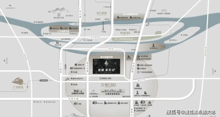 龙湖御湖境所在的番禺星河湾滨江板块,处于广州中轴南延线上,串联珠江新城、琶洲、万博三大核心CBD,是湾区产城融合发展的缩影。万博CBD作为番禺产业高地,聚集了大量互联网、科创企业,而滨江板块则承接了产业人群的高端居住需求,形成“产业+居住”的良性互动。