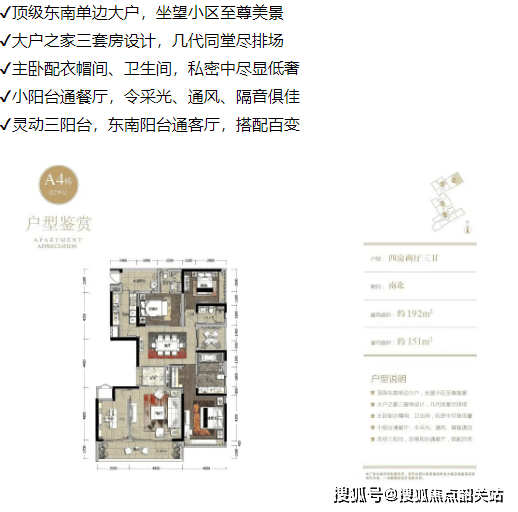 192㎡四房两厅三卫:灵动三阳台设计,东南阳台连接客厅,空间利用灵活多变;功能分区合理,满足多孩家庭或三代同住需求