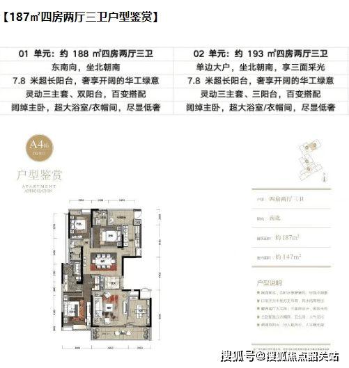 187㎡四房两厅三卫:东南单边大户设计,坐拥小区至尊美景;三套房布局适合几代同堂;主卧配备衣帽间和卫生间,小阳台通餐厅,采光、通风效果极佳。