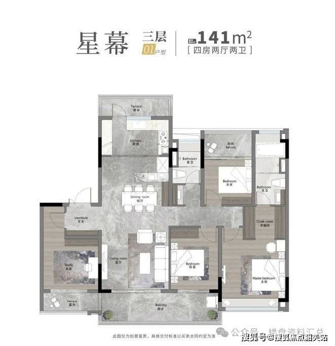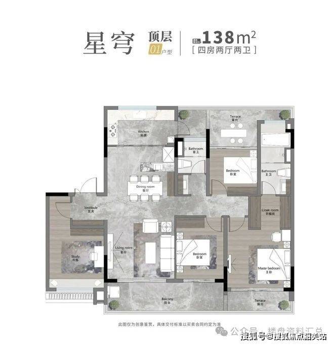 建筑产品形态以建面约140㎡改善型大平层为主,兼顾三至五房功能空间需求。产品设计强调功能性与居住舒适度之间的平衡,例如采用南向空间最大化原则,使主卧、客厅及主要生活区均面向阳光主采光面。部分户型配置露台空间与天台空间,形成空中花园式生活场景,可用于家庭休闲、社交会客或景观种植。住宅内部动线设计偏向现代主义空间逻辑,强调动静分区,使家庭成员能够在不同生活行为场景中获得独立空间体验。