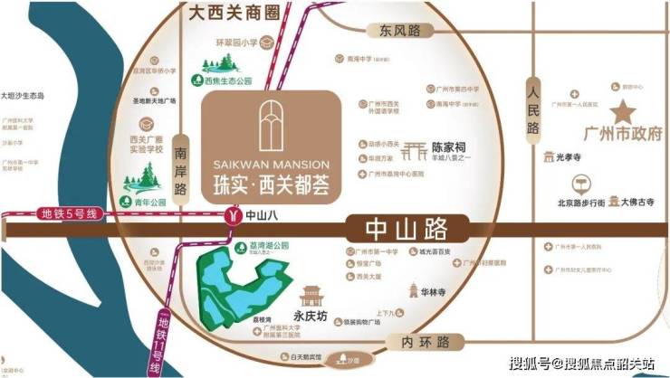 珠实·西关都荟位于中山八交通枢纽附近,周边交通十分便利。项目距离地铁5号线及在建的11号线仅约500米,实现0换乘直达白鹅潭、珠江新城CBD及琶洲CBD等核心商务区,极大提升通勤效率。同时,中山八站为广州重要TOD综合交通枢纽,整合地铁、公交及多条主干道路网,为住户提供“地铁+公交”的立体出行体系。