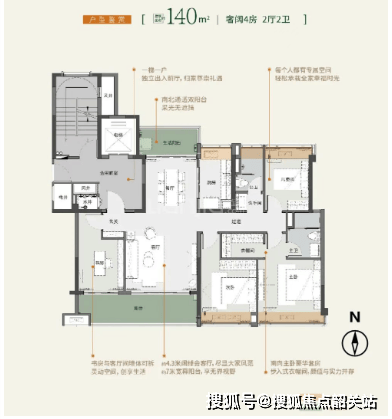 建面约 140 平方米的四房两厅两卫户型,主打高品质改善居住体验,专为追求生活质感的家庭打造。该户型采用一梯一户设计,业主拥有私享独立电梯厅,这部分空间可自行规划利用,既增加了使用面积,又极大提升了居住的私密性与尊贵感,告别电梯间拥挤嘈杂的问题。四开间朝南的格局让室内采光面达到最大化,清晨阳光便能铺满房间,营造温暖舒适的居住氛围;7 米南向观景阳台视野开阔,将室外园林景观与城市风光引入室内,闲暇时坐于阳台,便可享受惬意时光。主卧搭配全景飘窗,拓展了室内空间,提升了采光与观景效果,主卧套内卫生间设计,保障了主人的私密生活。整个户型空间尺度宽敞,客厅会客、餐厨用餐、卧室休憩等功能区划分合理,无论是日常居家还是亲友聚会,都能拥有从容舒适的体验,满足改善家庭对高品质居住空间的所有想象。
