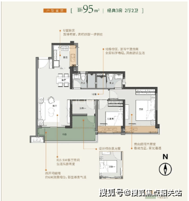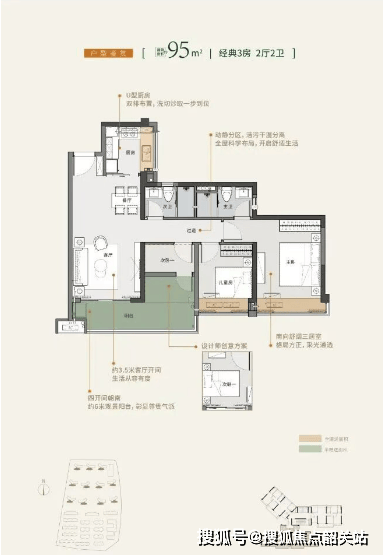 建面约 95 平方米的三房两厅两卫户型,是项目的主力走量户型,精准契合年轻首置家庭、单身青年或新婚夫妻的居住需求。该户型采用三开间朝南设计,最大化提升室内采光面,让房间常年阳光充足;竖厅格局实现动静分区清晰,客厅、餐厅、厨房等活动区域与卧室休息区域相互分隔,日常居家活动不会打扰休息空间,保障了居住的私密性与舒适度。入户处设置独立玄关,不仅可以收纳鞋子、包包、行李箱等日常物品,保持室内整洁,还能提升入户仪式感;6 米南向观景阳台拓宽了室内视野,连接客厅与卧室,既方便晾晒衣物,又能打造休闲小角落,部分户型还拥有 270° 转角采光,让室内通风效果更佳,即便小户型也能拥有通透舒适的居住体验。两个卫生间的设计,完美解决了早高峰洗漱拥堵问题,提升了居家生活效率,是刚需户型中的优质选择。