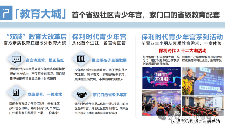 省级社区青少年宫:广东省首家省级直属社区青少年宫落户项目,由广东保利、广东省少年宫协会、广东省青少年社会教育协会三方签约打造,开设艺术、体育、科技、文化等多元素质课程,助力孩子全面发展。