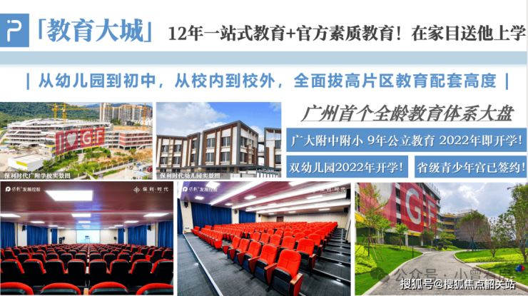 答:保利时代配建双幼儿园、45 班制广大附中附小,还有广东省首家省级社区青少年宫,周边 5 公里处有省一级重点广州市第六中学,形成 12 年一站式全龄教育体系。