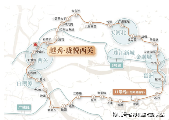 越秀珑悦西关售楼处电话:400-828-5661位于荔湾老西关板块中山八路附近,周边交通网络发达,为居民提供了多元且便捷的出行选择。项目距离5号线和在建的13号线二期交汇处西场站约1公里,步行约15分钟;距离在建的11号线中山八站约1.4公里,步行约21分钟;距离8号线彩虹桥站同样约1.4公里,步行约22分钟。
