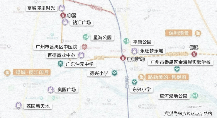 项目以**自驾为主、地铁短驳**,出行效率稳定。自驾方面,紧邻禺山西路、沙堤路,可快速接驳东新高速、番禺大道,约20分钟达万博CBD、30分钟抵珠江新城,通勤便捷。地铁方面,距3号线市桥站约3-4公里,需公交或电动车接驳,换乘后可快速通达番禺广场、海珠及珠江新城。周边1公里内分布多个公交站点,日常短距出行覆盖完善。