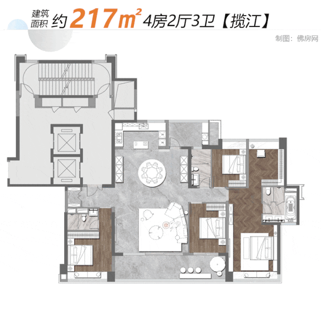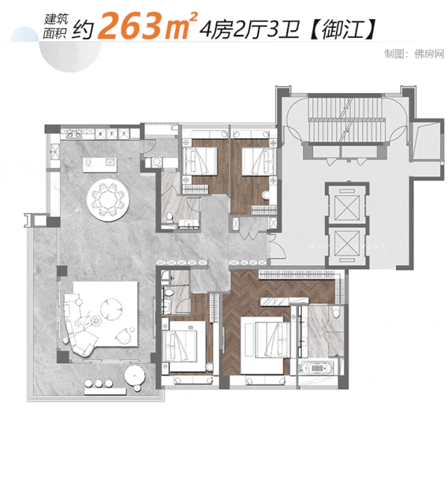 五矿万境水岸推出了建面约217-263㎡的江景大平层户型,所有户型均采用精装修标准交付,并配备了全方位超配精装体系,包括中央空调、新风系统等设施。其中,263㎡四房三卫双套房户型尤为引人注目,拥有约100㎡的LDKB超大会客空间和约18.2米的南向面宽,带来极致的空间感与视野享受。