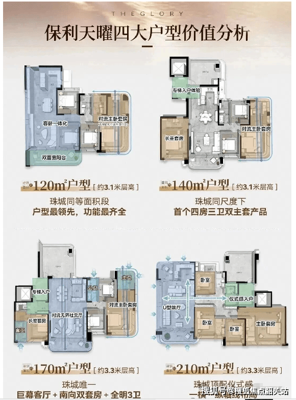 保利天曜提供多种户型选择,从建面约120-140㎡到170-210㎡云幕平层,全部采用T2板式设计,正南北全T2板楼,通风强,互视少,可延伸南向大面宽,规划更多南向开间,实现专梯入户。北地块则为全南向舒展T3/4楼型,楼栋/梯腿间法线相错,降低互视影响,户户皆为南向单边位,延长单体面宽,提升通风采光能力。