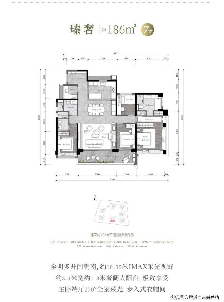 186㎡户型:顶级楼王户型,四房两厅三卫,拥有超大景观阳台,匹配塔尖人物的居住尺度。
