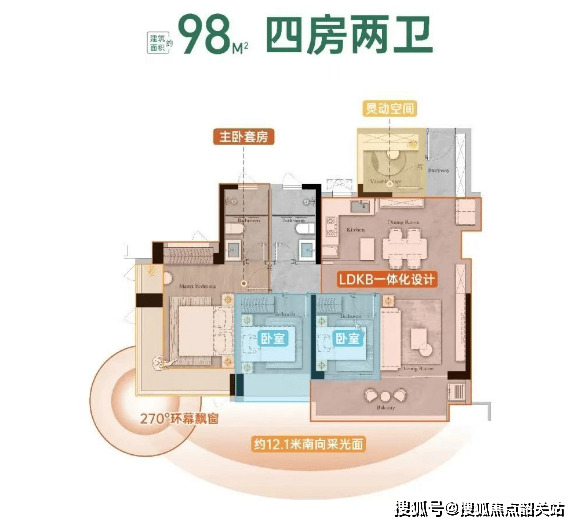 118㎡四房两卫:适合二胎家庭,客厅开间4.2米,南北双阳台,主卧带270°转角飘窗;