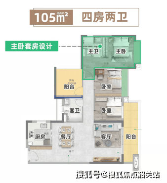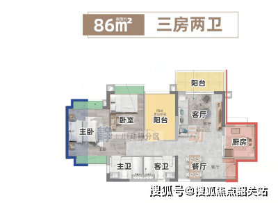 例如,86㎡户型做到了惊人的三房两卫配置,得房率超过9成,动静分区明确,南北对流、双阳台设计等细节保证了居家的舒适度。