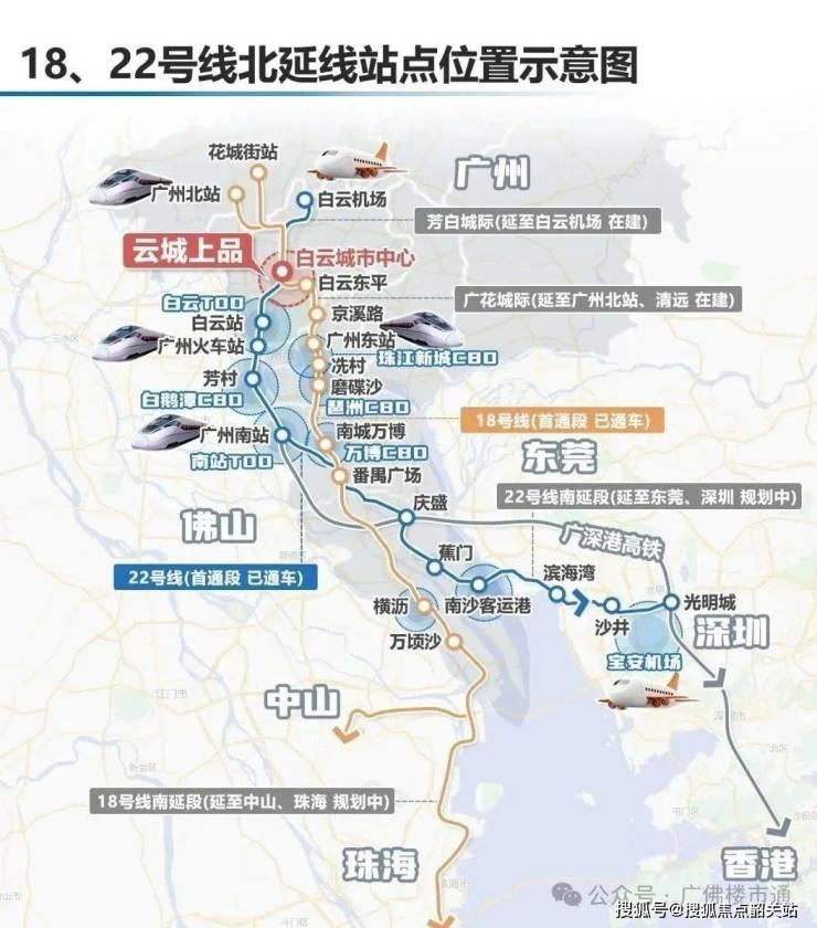 云城上品位于在建中的地铁白云城市中心站上盖,这个站点规划了18号线和22号线两条高速地铁,最高时速可以达到160公里,其中通过18号线未来可以直达广州东站的白云机场,通过22号线则可以直达广州南站