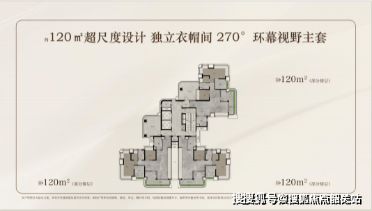 120㎡四房:总价1140万起,南向四开间,阳台面宽7.2米,实测使用率105%。