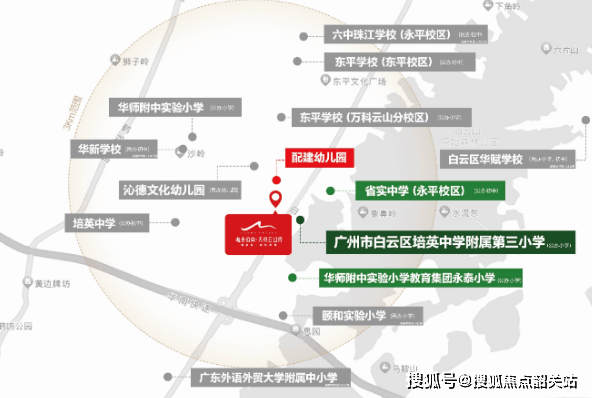 优质教育配套:项目配建了一所9班幼儿园,并且对口的是广州市白云区培英中学附属第三小学(原凤凰小学)。这所学校引进了“培英教育集团”合作办学,教学质量及设施有望全面提升。周边3公里范围内还有华师附小、培英中学、省实中学等多所知名学校,形成顶尖教育圈层。