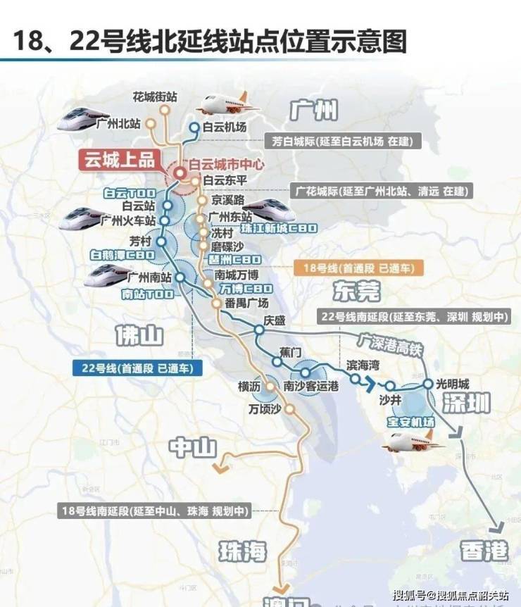 项目距离在建的白云城市中心站仅约200米,属于真正意义上的地铁上盖。根据规划,该站为18号线北延段与22号线北延段的换乘站,未来3站到广州东站、4站直达珠江新城,通勤效率在广州北部片区里算得上能打。虽然线路预计2026年底才通车,但站点位置已明确,周边路网也正在同步升级,早晚高峰打车到白云新城核心区大约15分钟。