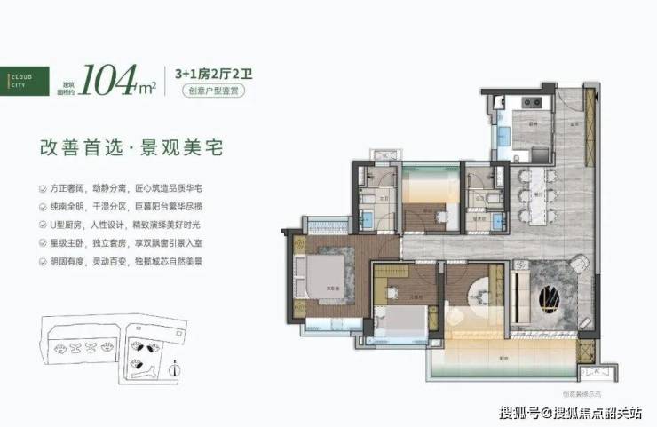 主力户型从72㎡起跳,全部做成四房,这在同区域不多见。以72㎡样板间为例,采用竖厅+U型厨房+主卧带飘窗的设计,次卧和书房虽紧凑但功能完整,适合三口之家或与父母同住的小家庭。88㎡和105㎡则优化了公区动线,客厅开间更大,阳台连通次卧形成半通透空间,提升通风和视野。所有户型均为精装修交付,用材和品牌清单可在现场查阅。