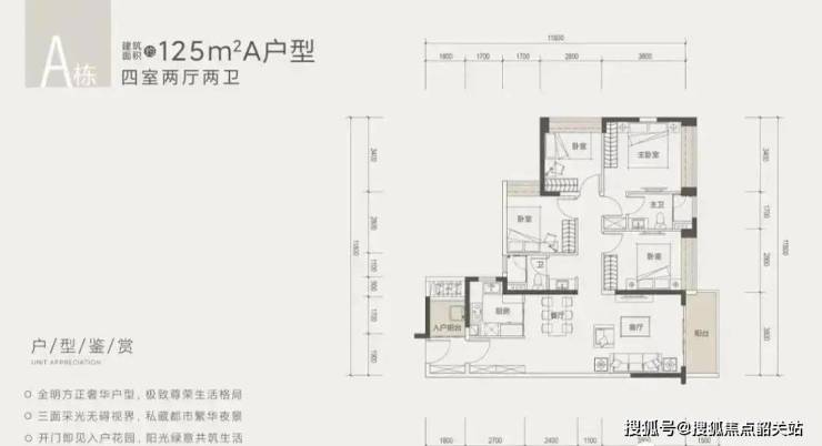 建面约125㎡四房:格局相对方正,均为北向设计。