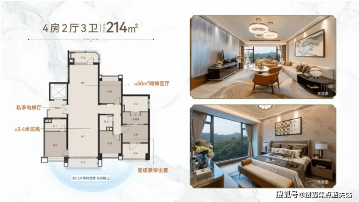层高 3.4 米,远超普通住宅,空间感十足,北望山景、南赏园林
