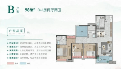 洋房臻藏:主推建面约88-98平方米N+1灵动户型,得房率超80%,并配备了双卫配置。