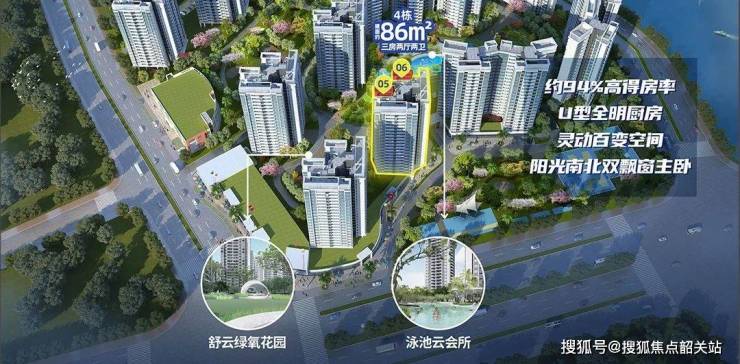 提供从86㎡至152㎡不等的奢适多功能N+1房型,其中约86㎡产品实现三房两卫,得房率超9成。