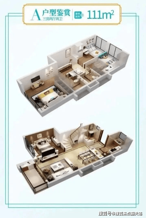 主力户型为97㎡三房(可灵活组合为0+3或1+2)和111㎡四房,均带复式结构。以97㎡为例,一层设客餐厨和公卫,二层布置卧室区,动静分区清晰;更关键的是,每套额外赠送约33–36㎡面积,相当于多出一个功能房或大露台的空间。实际得房率明显高于普通平层,对注重空间效率的家庭很友好。