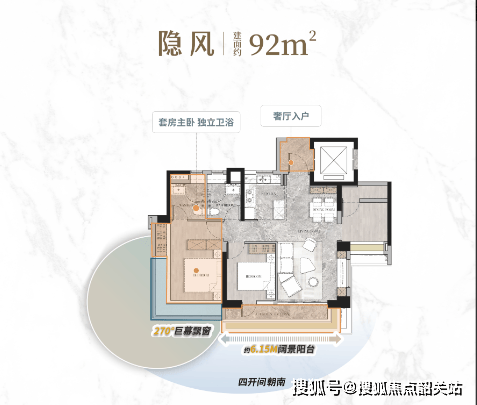 建面约92㎡:四开间朝南,拥有约6.15米阔景阳台和270°巨幕飘窗。