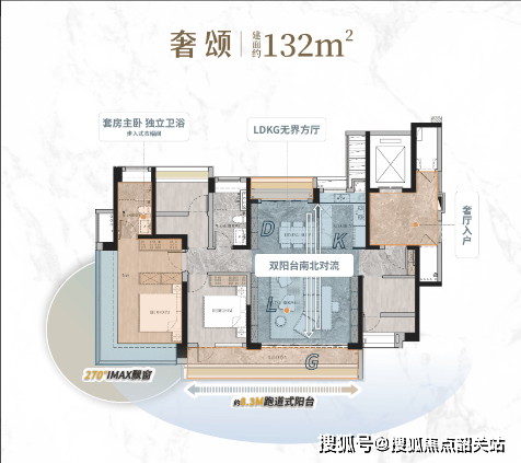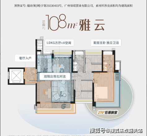 建面约108㎡:LDKG+X一体化设计,双阳台布局,270°巨幕飘窗。