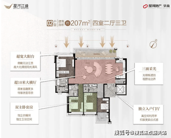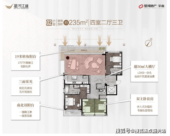 A:均为双主卧套间设计,带超宽大阳台与三卫浴空间,235㎡户型享 270° 转角阳台,LDKB 一体化布局,得房率高。