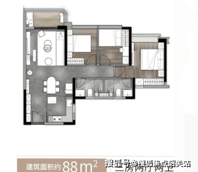 88㎡ 三房两厅两卫:万象·荧曜户型,四开间朝阳,全面屏采光环幕视野。