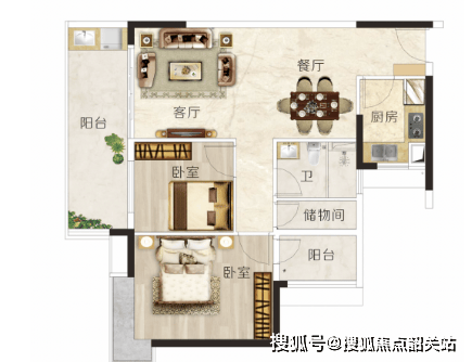 B户型:建面约85平方米,2房2厅1卫,设计方正实用,拥有三分离卫生间。