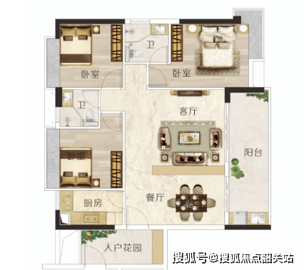 A户型:建面约101平方米,3房2厅2卫,配备入户花园和超广角巨幕阳台。