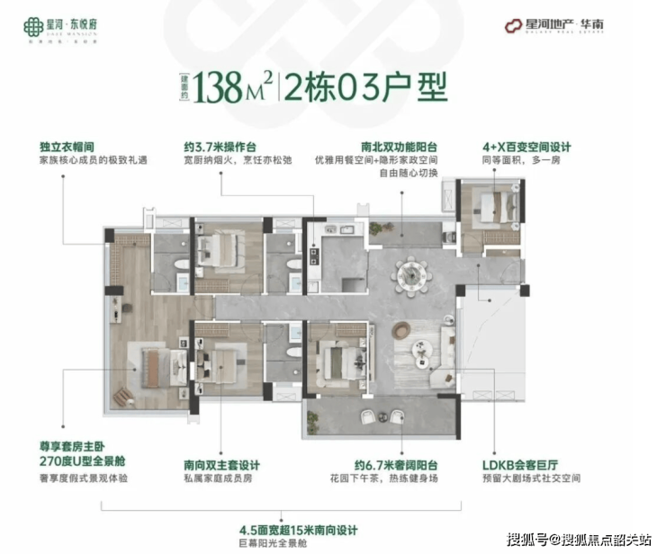 星河东悦府由星河控股开发,秉承“以人为本、宜居优先”的社区理念,致力于为南沙区府板块购房者打造高舒适度、高实用率的居住环境。项目涵盖89-138㎡多种四房产品,设计亮点包括可砸全赠送飘窗、超高使用率户型以及南北通透布局,让空间利用率达到128%,同等面积相比市场其他产品多出一房,满足刚需和改善型家庭的多元需求。住宅户型布局兼顾采光、通风和储物功能,体现现代居住美学。