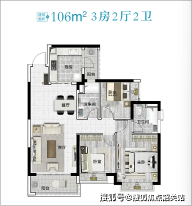 建面约 106㎡三房两厅两卫:三口之家改善首选,明厨明卫设计,双阳台配置(观景 + 生活),全屋飘窗提升实用率;三开间朝南确保全屋采光通透,每个卧室尺度舒朗,家庭成员均有独立活动空间,居住舒适度高。