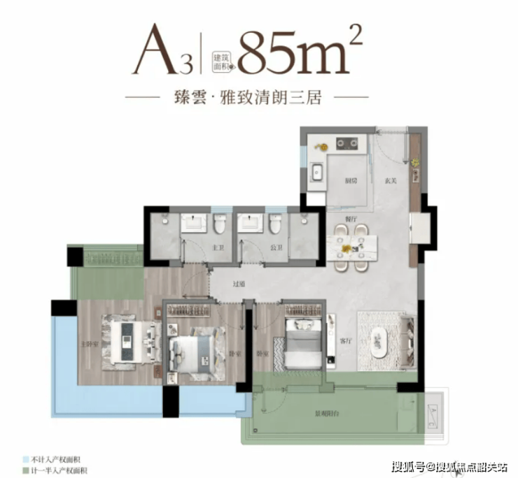 分布于 1 号楼,共三种户型:A2、A3 户型实现客厅 + 三个卧室全朝南,四开间朝南,采光面超宽;A4 户型为南北对流设计,通风效果极佳。户型采用 LDKG 一体化宽厅设计,空间通透开阔;主卧带 270° 无边观景飘窗,尽揽山景与园林;三房布局满足三口之家或三代同堂基础居住需求,空间利用率拉满,刚需首选。