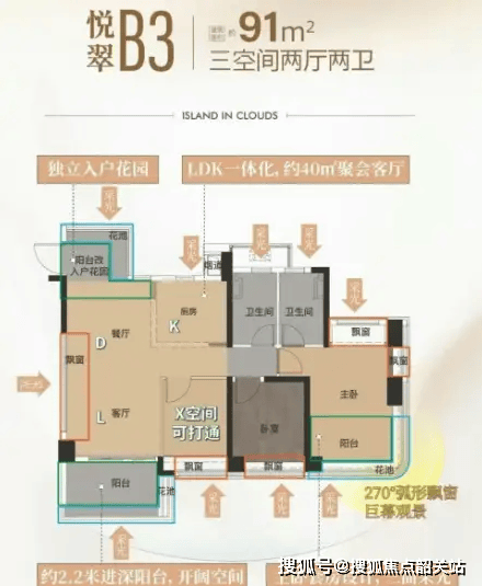 建面约91㎡三房两卫:总价约440–490万,兼顾实用性与生活质感。L型飘窗玄关巧妙拓展收纳空间,厨房配置中西双用岛台,满足现代烹饪与社交需求;主卧打造270度景观飘窗,视野开阔,采光优越,适合追求品质生活的三口之家。