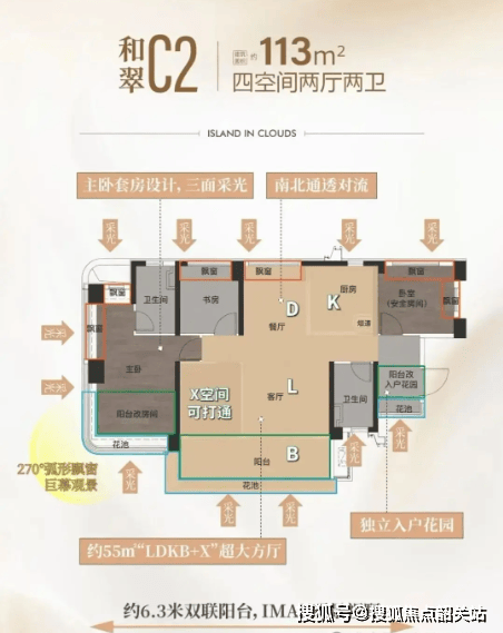 建面约113㎡四房两卫:总价580–650万,为改善型家庭量身定制。采用南北对流横厅设计,空气流通更佳;独立入户花园提升归家仪式感;约6.3米长阳台连通次卧,延展生活场景;主卧配备270度弧形全景飘窗,营造酒店式居住体验,空间尺度与功能分区均达到进阶水准。