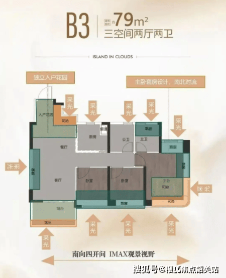 建面约79㎡东南向三房两卫:总价400万起,是海珠罕见的入门级三房产品。独立入户玄关提升私密性,客厅直通阳台引光入室,三间卧室全部朝南,主卧配备独立卫浴,功能齐全且动线合理,非常适合首次置业或年轻小家庭。