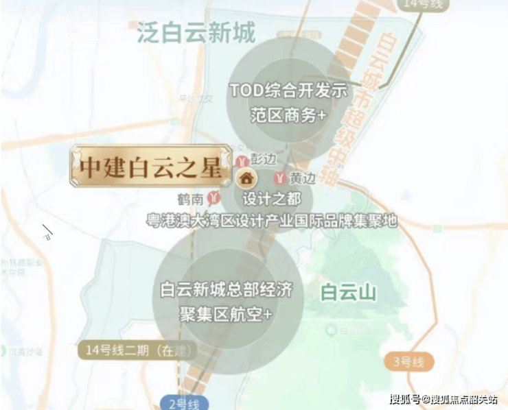9 中建·白云之星所在的设计之都板块,依托白云新城核心资源与双地铁TOD优势,形成“区府+TOD”双核心联动发展格局。白云新城作为白云区区府所在地,是行政、商业、文化核心,集聚千亿级配套;嘉禾望岗TOD作为2、3、14号线换乘枢纽,是白云北部交通核心,承接人流与资源集散。项目处于双核心辐射叠加地带,既享受白云新城的成熟配套与政策红利,又借助地铁2号线黄边站与14号线彭边站的TOD优势提升出行效率,同时承接设计之都的产业动能,这种“区府资源+TOD交通+产业核心”的三核驱动,为项目提供坚实价值支撑。