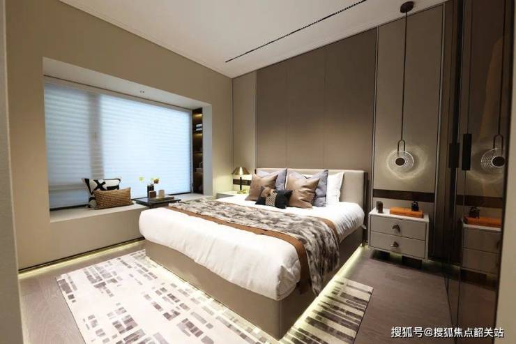 主卧套房南北对流,配备了L型南向飘窗,270°俯瞰江景。要知道,市面上建面约200㎡的大平层,才会配备这样的转角景观飘窗。