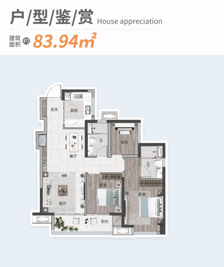 约85㎡三房两厅两卫户型,通过紧凑布局实现三房功能配置。客厅连接景观阳台,增强通风与采光表现。功能分区明确,满足年轻家庭首次置业需求。